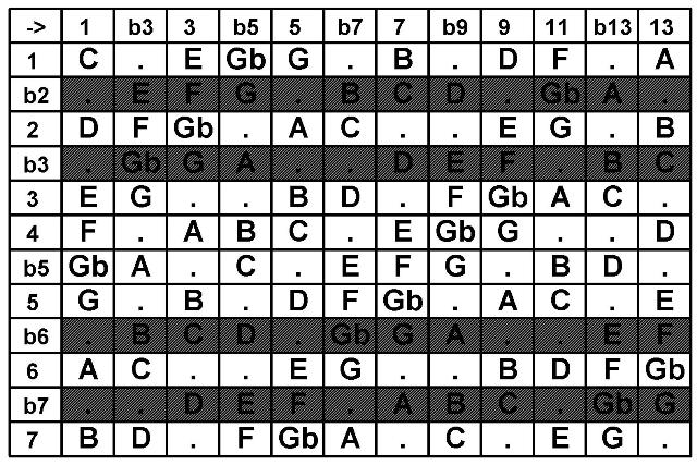 across row 2 the next chord note is a Gb (a flatted 5th interval from the chord